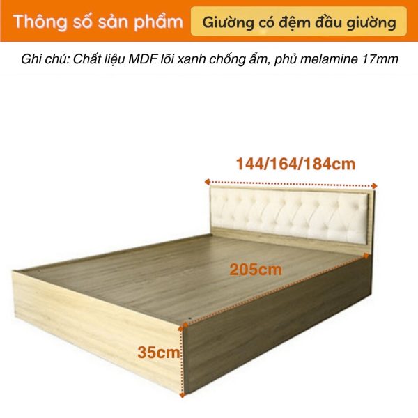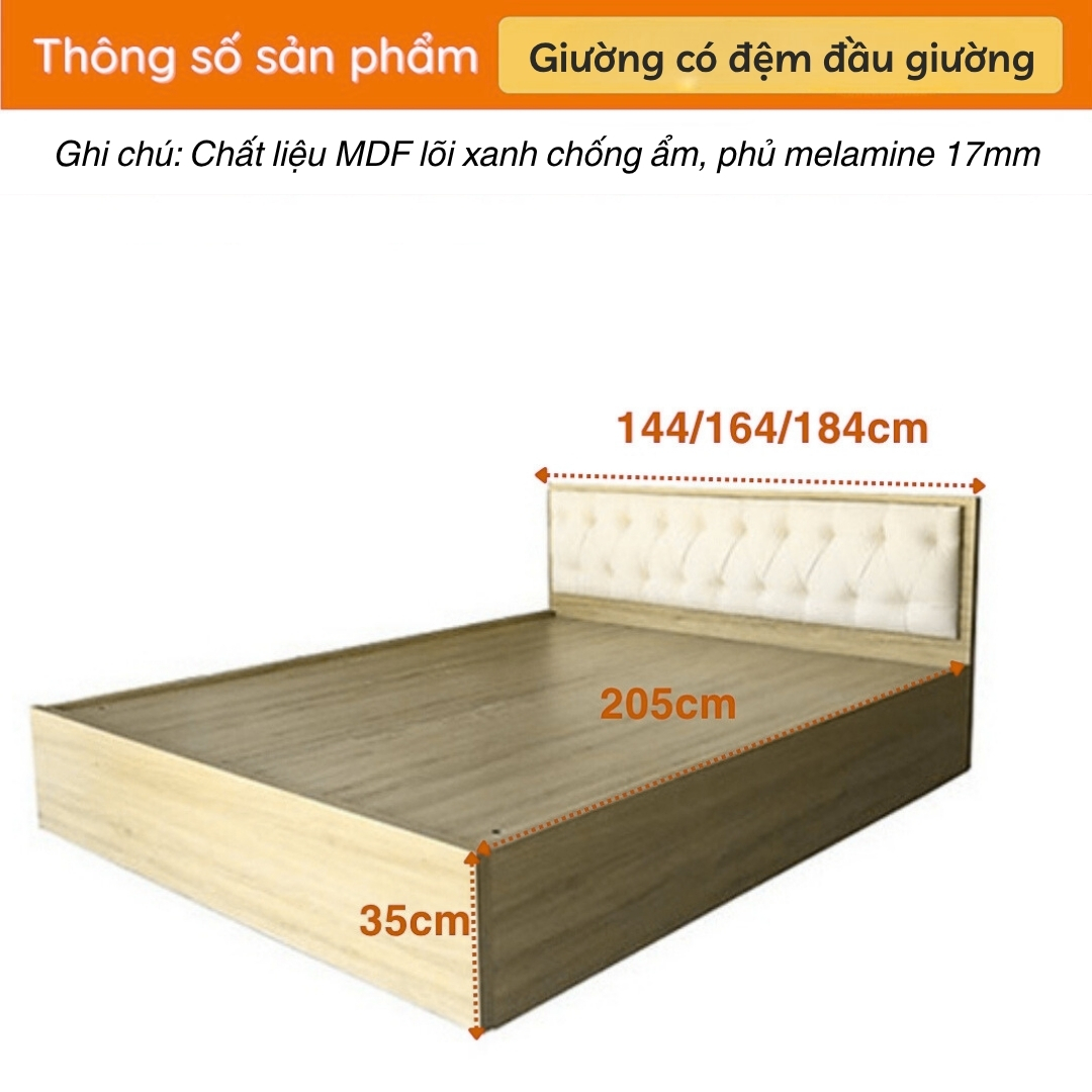- Gỗ MDF Lõi Xanh Chống Ẩm Dày 17mm: Khung và ván giường sử dụng gỗ công nghiệp MDF (Medium Density Fiberboard) lõi xanh HMR (High Moisture Resistance) với độ dày tiêu chuẩn 17mm. Lõi xanh có khả năng chống ẩm mốc vượt trội so với MDF thông thường, cực kỳ phù hợp với khí hậu nhiệt đới ẩm của Việt Nam.
